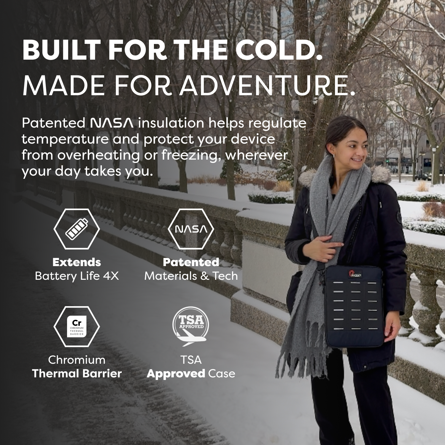 Made from materials originally developed by NASA for spacesuits, our patented Chromium Thermal Barrier helps prevent your devices from overheating in the sun and shields against battery zapping cold to extend battery life.