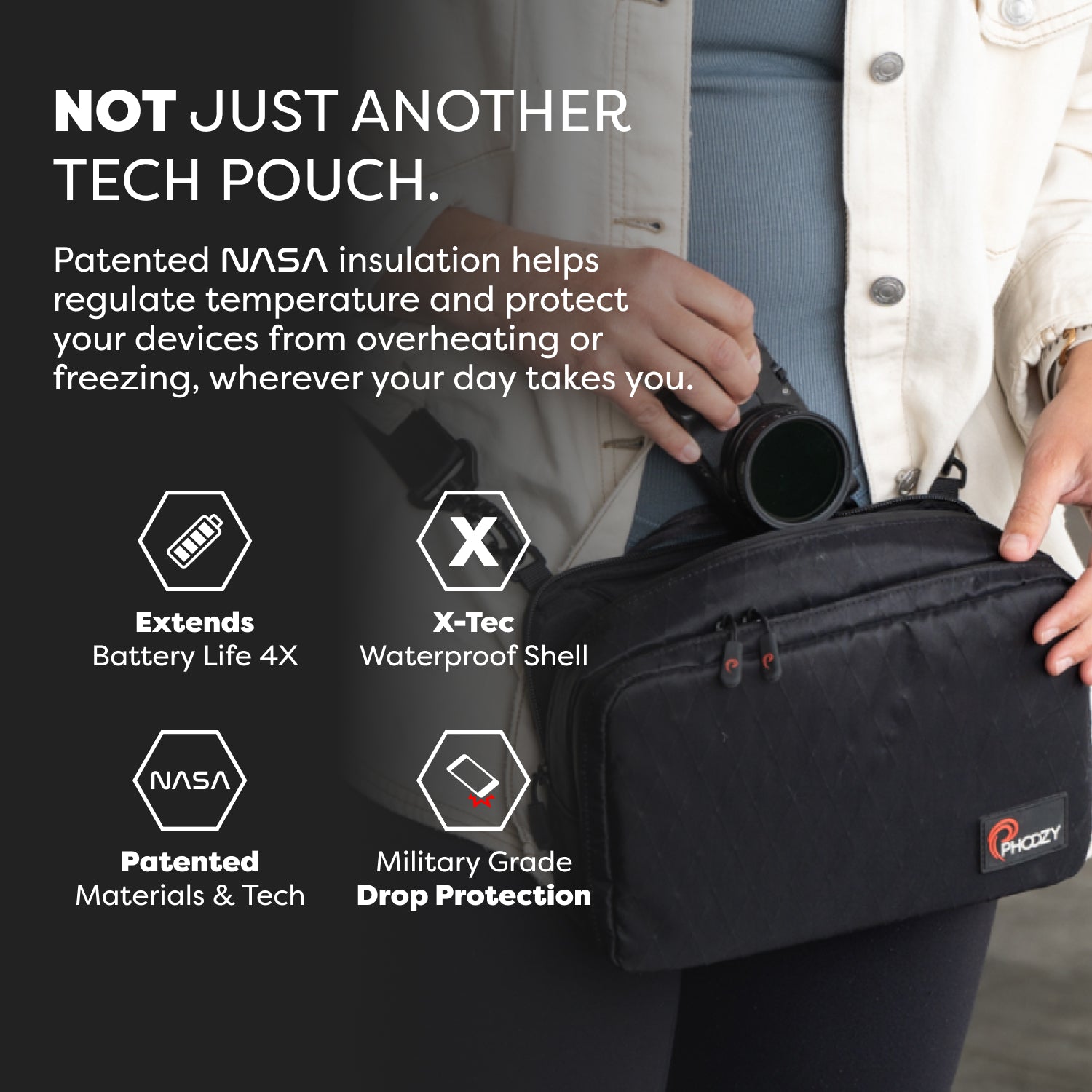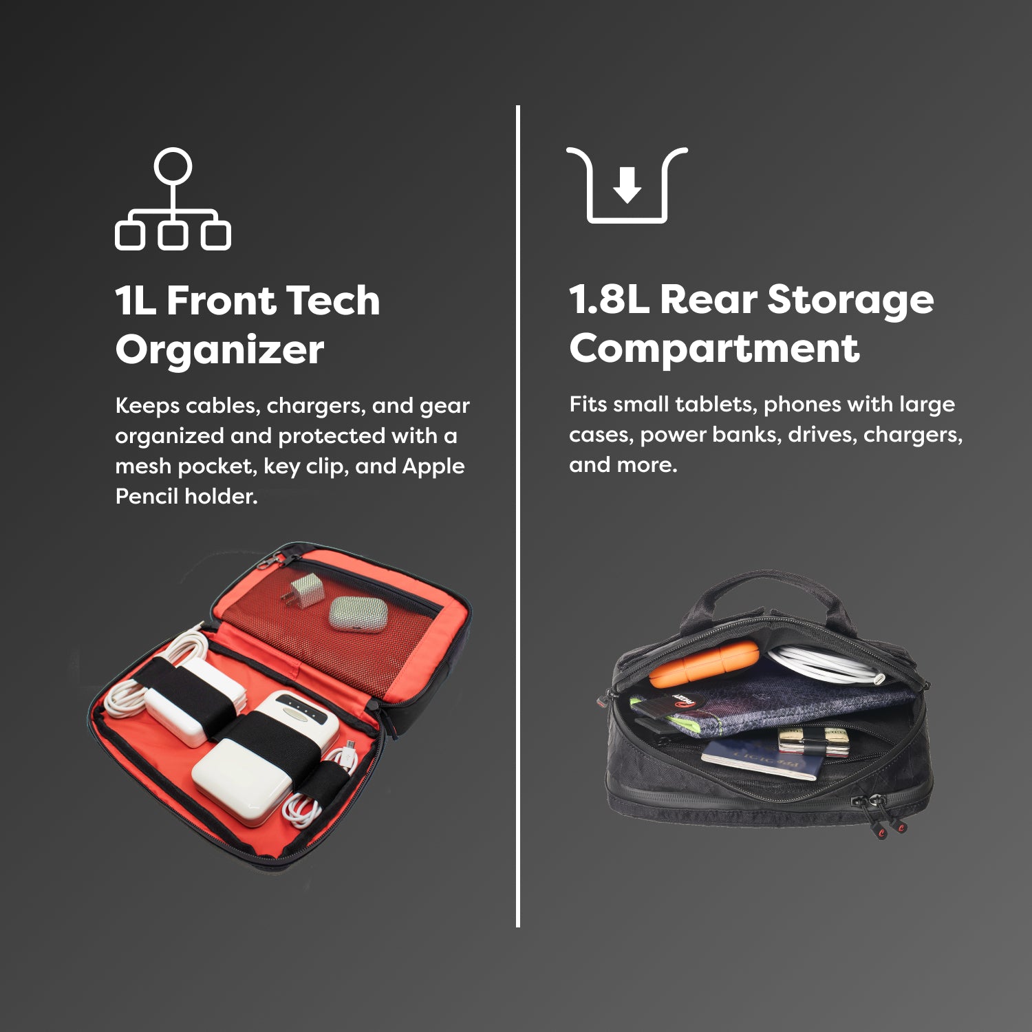Conveniently carry your phone, chargers, cables, power bank, AirPods, keys/fobs, wallet and other personal essentials (and anything else you can think of).